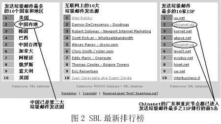 圖2是國際上著名的反垃圾郵件組織Spamhaus在網(wǎng)站上列出的統(tǒng)計排行榜,“China”已經(jīng)穩(wěn)居第二大垃圾郵件發(fā)送國的位置,而右邊的一個排行榜則從另一個角度向我國敲響了警鐘——在專為發(fā)送垃圾郵件的ISP所列的黑名單SBL中,我國Chinanet的兩個省級ISP在前10名中分列第2和第5名。而Chinanet作為中國的公用信息互聯(lián)網(wǎng)絡(luò),是我國的Internet骨干網(wǎng),是國內(nèi)用戶接入互聯(lián)網(wǎng)的主要途徑之一!拔覀冋娌幌M赃@樣的方式‘揚名海外’”,來自一家ISP的一位不肯透露姓名的女士說,“其實我們也是受害者!”