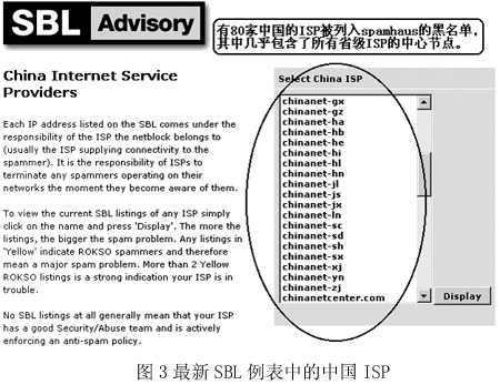 垃圾郵件損害的不只是中國的國際形象,中國反垃圾郵件聯(lián)盟的葉豪告訴記者,類似SBL(更一般的是RBL,即“實時黑名單”)這樣的服務(wù)是由國外的一些公司或第三方組織提供的,目前已經(jīng)成為國際上比較通行的防范垃圾郵件的措施。而在具備較高知名度的Spamhaus所維護的這份黑名單中,我國的ISP竟然多達80家(如圖3),幾乎所有的省級ISP都位列其中!爸袊芏啻蟮腎SP都在不同的‘黑名單’里,從這些國內(nèi)ISP發(fā)出的郵件,那些用‘黑名單’的客戶根本就收不到,F(xiàn)在‘黑名單’是比較好用的一種辦法,所以使用‘黑名單’服務(wù)的企業(yè)也越來越多,國際上針對中國的信息壁壘就越來越厲害,再不采取措施,中國就等著被全世界‘封掉’吧!”