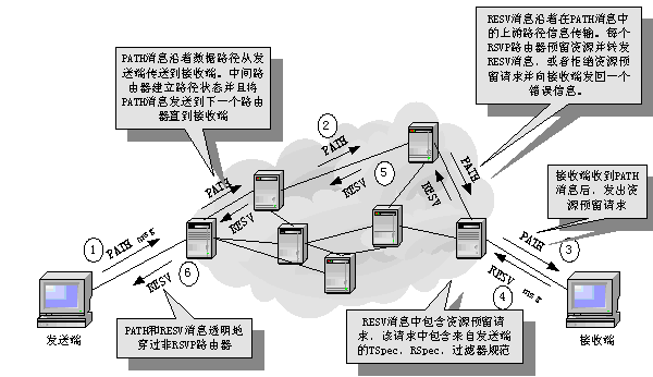 綜合服務(wù)和資源預(yù)留協(xié)議IntServ/RSVP:以RSVP信令向網(wǎng)絡(luò)提出業(yè)務(wù)流傳輸規(guī)格(Flowspec),并建立和拆除傳輸路徑上的業(yè)務(wù)流狀態(tài)。主機(jī)和路由器節(jié)點(diǎn)建立和保持業(yè)務(wù)流狀態(tài)信息。盡管RSVP經(jīng)常用于單個流,但也用于聚流的資源預(yù)留。