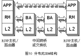 SBM有兩種形式的體系結(jié)構(gòu):集中式結(jié)構(gòu)和分布式結(jié)構(gòu),它取決于BA所處的位置,如圖9和圖10所示。不管在哪種形式的結(jié)構(gòu)中,RM都必須在需要請求資源的端系統(tǒng)中。APP表示需要使用RM的應(yīng)用,它可以是用戶應(yīng)用程序,也可以是高層協(xié)議(如RSVP)。
