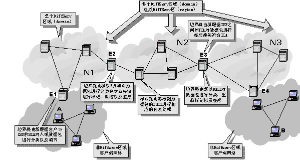 DiffServ區(qū)(region)則是由連續(xù)的DS區(qū)域構(gòu)成。一個DS區(qū)內(nèi)的DS區(qū)域可以支持不同的PHB組,并且各自區(qū)域的DSCP到PHB的映射函數(shù)也可能不相同。在不同的DS區(qū)域之間,必須對SLA和TCA進(jìn)行調(diào)節(jié),以協(xié)調(diào)彼此之間的服務(wù)語義。這樣,通過在上游DS區(qū)域和下游DS區(qū)域之間建立SLA或TCA,區(qū)分服務(wù)可以擴(kuò)展到多個DS區(qū)域。