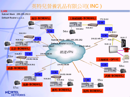 此系統(tǒng)的VPN線路由中國網(wǎng)通公司提供,INC上海浦東生產(chǎn)基地為主點(diǎn)(Nortel OP11C)系統(tǒng)通過ITG(Internet Telephone