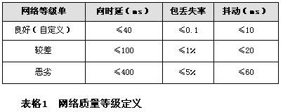 描述承載網(wǎng)性能指標(biāo)的參數(shù)主要有帶寬、時(shí)延、時(shí)延抖動(dòng)、丟包率等,其中帶寬是一個(gè)基本要求,必須滿足規(guī)劃的帶寬要求。根據(jù)通信行業(yè)標(biāo)準(zhǔn)YD/T1071-2000《IP電話網(wǎng)關(guān)設(shè)備技術(shù)要求》,網(wǎng)絡(luò)質(zhì)量可以分為以下三級(jí):