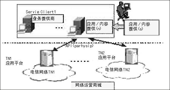 這種模式是指應(yīng)用服務(wù)器的兩部分應(yīng)用平臺和業(yè)務(wù)提供分別由傳統(tǒng)電信運(yùn)營商和AP控制。應(yīng)用平臺在運(yùn)營商域內(nèi)由運(yùn)營商進(jìn)行控制,而AP或者CP(Content provider)可以與傳統(tǒng)電信運(yùn)營商簽約來提供業(yè)務(wù),業(yè)務(wù)與應(yīng)用提供通過開放的API由第三方提供。