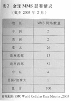 據(jù)EMC統(tǒng)計(jì),到2003年2月,全球在47國(guó)家有100家運(yùn)營(yíng)商部署了MMS網(wǎng)絡(luò)(見(jiàn)表2)。