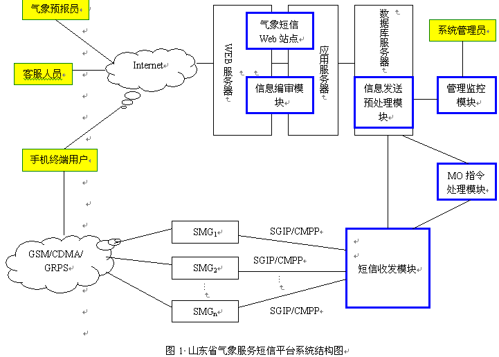 山東省氣象臺(tái)為實(shí)現(xiàn)“1210手機(jī)氣象站”服務(wù),通過(guò)技術(shù)合作的方式建設(shè)了山東省氣象服務(wù)短信平臺(tái)。該平臺(tái)采用操作系統(tǒng)無(wú)關(guān)、開放性好的J2EE軟件架構(gòu),數(shù)據(jù)庫(kù)選用處理能力強(qiáng)、穩(wěn)定性好的Oracle9i大型數(shù)據(jù)庫(kù)系統(tǒng),該平臺(tái)目前正在為全省50萬(wàn)用戶每天通過(guò)短消息提供各種天氣預(yù)報(bào)服務(wù)。下面將主要介紹氣象短信平臺(tái)的系統(tǒng)結(jié)構(gòu)、各模塊功能和系統(tǒng)特點(diǎn)。