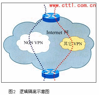 從圖2可以看出,邏輯隔離是在現(xiàn)有的運營商數(shù)據(jù)網(wǎng)基礎(chǔ)上,利用已經(jīng)比較成熟的VPN(如MPLSVPN)技術(shù)將網(wǎng)絡(luò)資源進(jìn)行隔離:將網(wǎng)絡(luò)劃分為兩個邏輯子網(wǎng),一個是Internet業(yè)務(wù)子網(wǎng),另一個是NGN業(yè)務(wù)子網(wǎng)。兩個子網(wǎng)通過VPN進(jìn)行隔離。NGN業(yè)務(wù)與Internet業(yè)務(wù)的區(qū)分在邊緣路由器PE上完成,PE根據(jù)物理接口或邏輯接口區(qū)分業(yè)務(wù)的類型,邏輯接口可以是VLAN,PVC等。在NGN子網(wǎng)中,再有針對的對QoS以及安全等問題進(jìn)行解決。