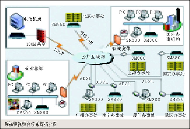 。。本系統(tǒng)中包含多個(gè)會(huì)場(chǎng),使用瑞福特SM 880硬件終端,每個(gè)會(huì)場(chǎng)采用單獨(dú)的ADSL接入(也可采用其他接入方式),能夠保證發(fā)送與接收320×240、25