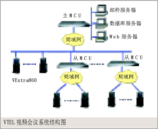 。。圖中各會(huì)議節(jié)點(diǎn)均配置一臺(tái)VTEL VExtra視頻會(huì)議終端,通過(guò)E1電路接入網(wǎng)絡(luò)中心的Meta