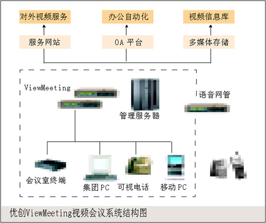 。。ViewMeeting是優(yōu)創(chuàng)科技利用最新的視頻通信技術(shù),面向企業(yè)用戶(hù)推出的功能強(qiáng)大的可視協(xié)同辦公系統(tǒng)。它是綜合了最新的視頻會(huì)議、數(shù)據(jù)協(xié)作、即時(shí)通信、語(yǔ)音網(wǎng)關(guān)等多種技術(shù)的企業(yè)協(xié)同辦公產(chǎn)品,能最大程度地滿(mǎn)足企業(yè)機(jī)構(gòu)的視頻通信需求。利用ViewMeeting,用戶(hù)可以方便地在企業(yè)網(wǎng)上進(jìn)行視頻會(huì)議、網(wǎng)上培訓(xùn)、即時(shí)點(diǎn)到點(diǎn)通信、協(xié)作討論等多種應(yīng)用。企業(yè)可以選用以下產(chǎn)品組建ViewMeeting系統(tǒng):