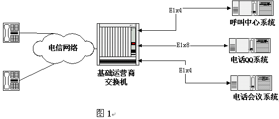 一種方式為固定分配, 即為每種語音系統(tǒng)分配固定數(shù)量的E1中繼,如圖1所示,這種方式的問題主要有兩個方面:一是中繼資源沒有充分共享使用,比如在晚上,可能電話QQ業(yè)務(wù)量很大而呼叫中心很小,而白天卻正好相反。如果為每一種業(yè)務(wù)都留有很大的中繼富裕又勢必導(dǎo)致中繼資源的浪費;二是當中繼線路來源于多個運營商時存在連接上的困難。