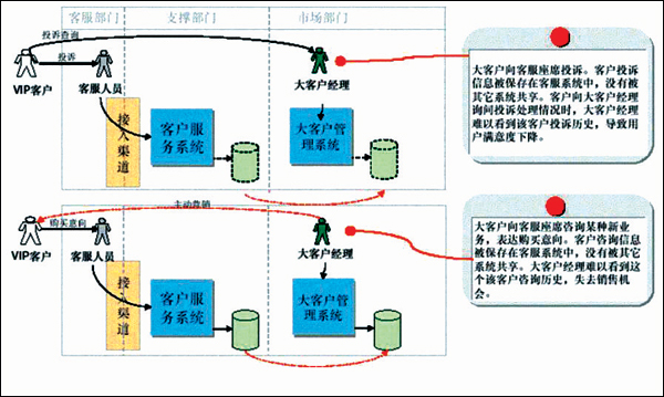 投訴的后臺處理流程分布在BOSS系統(tǒng)、1860客服中心、DSMP數(shù)據(jù)業(yè)務(wù)管理平臺以及OA多個業(yè)務(wù)支撐系統(tǒng)之中,系統(tǒng)之間相對獨立,同時投訴的交互數(shù)據(jù)分散在各個系統(tǒng)內(nèi),沒有一個完整、統(tǒng)一的客戶投訴資料,從而無法在不同的服務(wù)渠道中取得完整的客戶投訴信息,影響了客戶服務(wù)的質(zhì)量。當(dāng)公司管理層需要了解某一項活動的開展情況或近期的投訴熱點、焦點問題時,操作人員只能采用傳真方式,臨時要求全省17地市、公司在一定時間內(nèi)上報,匯總后研究分析再行提交,使投訴熱點或焦點問題不能及時反饋給管理層。信息嚴(yán)重滯后,更談不上針對客戶投訴咨詢熱點問題進(jìn)行數(shù)據(jù)挖掘,推出針對性的營銷策略。