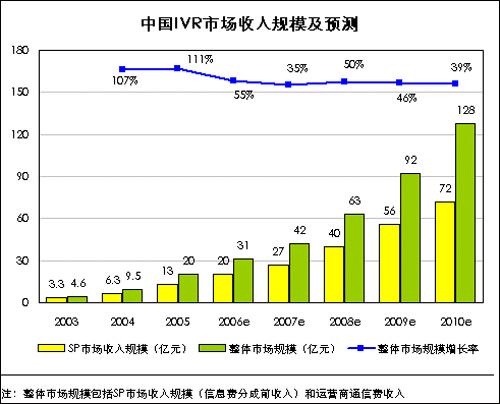 iResearch通過研究分析,2005年中國IVR市場總體收入規(guī)模(包括通信費及信息費)為20億元,2006年將達到31億元,預(yù)計到2010年將達到128億元,市場增長率將呈現(xiàn)逐步下降的趨勢。其中IVR市場中SP的收入規(guī)模在2005年為13億元,2006年將達到20億元。