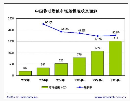 隨著中國移動電話用戶的不斷增長和移動增值服務(wù)的不斷發(fā)展創(chuàng)新,移動增值服務(wù)已經(jīng)成為現(xiàn)隨著市場的發(fā)展和不斷規(guī)范,中國移動增值服務(wù)市場將進(jìn)入相對平穩(wěn)的發(fā)展階段。據(jù)iResearch預(yù)測,中國移動增值服務(wù)的市場規(guī)模增長速度將逐年減緩,到2008年受奧運(yùn)會影響增長速度提高,規(guī)模將突破1500億元。