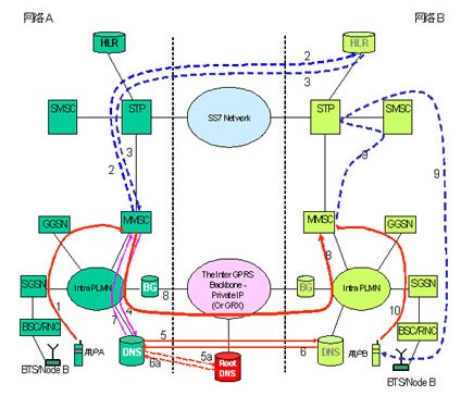 用戶A發(fā)送MM消息給用戶B。MM消息通過網(wǎng)絡(luò)A的SGSN(Serving GPRS Support Node)、GGSN(Gateway