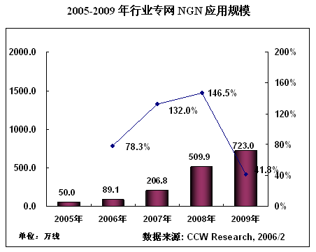 在運(yùn)營(yíng)商N(yùn)GN建設(shè)高速增長(zhǎng)的同時(shí),政府、能源、交通等行業(yè)專網(wǎng)NGN建設(shè)也逐漸步入快車道。NGN在行業(yè)專網(wǎng)的應(yīng)用,到2005年底的應(yīng)用規(guī)模達(dá)到50萬(wàn)線,根據(jù)計(jì)世資訊(CCW Research)《2005-2006中國(guó)NGN產(chǎn)業(yè)應(yīng)用趨勢(shì)研究報(bào)告》的預(yù)測(cè),未來4年,NGN在行業(yè)專網(wǎng)市場(chǎng)將以95%的復(fù)合增長(zhǎng)率高速增長(zhǎng)。
