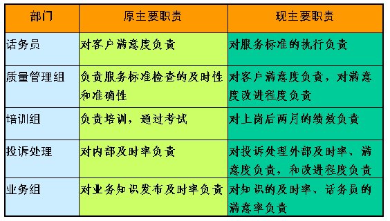 首先,要根據(jù)組織的目標(biāo)來確定我們需要哪些流程,即需要哪些流程才能保證組織目標(biāo)的實(shí)現(xiàn);其次,根據(jù)流程的需要,即為了保證流程的有效運(yùn)行,來劃分不同部分的職責(zé);最后,根據(jù)各部分職責(zé)的劃分來設(shè)置組織的架構(gòu)。如我們根據(jù)客服中心流程運(yùn)行的需要,對組織架構(gòu)和相關(guān)班組的主要職責(zé)進(jìn)行了調(diào)整,以保證流程的有效順暢運(yùn)行。如部分班組的主要職責(zé)調(diào)整如下:
