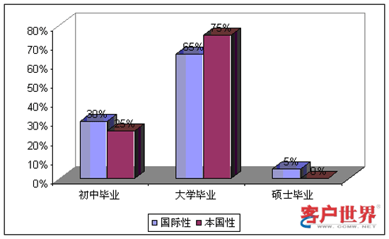 總的而言,參加調(diào)研的呼叫中心雇用的員工接受了平均15年的正式教育,也就是大學(xué)畢業(yè)的一般水平。國際性和本地型呼叫中心在勞動(dòng)力的受教育水平上沒有呈現(xiàn)明顯差異。其中,30%的國際性和25%的本國性呼叫中心大量雇用初中畢業(yè)程度(12年教育)的員工;65%的國際性和75%的本國性呼叫中心雇用高中畢業(yè)程度(15年教育)的員工;此外,5%的國際性呼叫中心,往往是提供技術(shù)支持服務(wù),主要雇用碩士畢業(yè)水平(17年教育)的員工。
