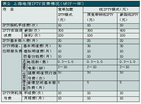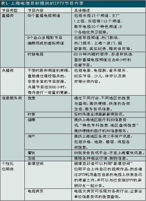 上海電信是國內(nèi)關(guān)注并切入IPTV業(yè)務(wù)較早的電信運營商之一,自2005年就開始積極測試和試驗。此次上海電信在全上海市范圍內(nèi)推出IPTV業(yè)務(wù),被業(yè)界看作是“中國IPTV規(guī)模商用的新紀(jì)元”。除了影視節(jié)目收看、視頻內(nèi)容點播、時移功能外,上海電信的IPTV服務(wù)還包括時事新聞、遠(yuǎn)程醫(yī)療、視頻房產(chǎn)信息、餐飲信息、天氣預(yù)報、票務(wù)查詢等信息服務(wù)以及可視電話、IPTV游戲等個性化應(yīng)用。其中IPTV的直播頻道有58個,視頻點播可選節(jié)目量達(dá)3000小時以上。另外,上海電信還推出了影像空間和電視大黃頁等應(yīng)用服務(wù),攝像愛好者可以利用“影像空間”應(yīng)用平臺上傳自己的視頻作品,然后通過IPTV機(jī)頂盒在自家的電視上欣賞自己的得意之作,并可以與已安裝IPTV的親朋好友一起分享;電視大黃頁可實現(xiàn)對各類行業(yè)、企事業(yè)單位信息資訊的搜索查詢。