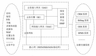 在電信集團(tuán)的統(tǒng)一規(guī)劃下,ISMP和SAG相繼推出。ISMP是綜合增值業(yè)務(wù)管理平臺(tái),ISMP不但可以解決現(xiàn)網(wǎng)固網(wǎng)/PHS業(yè)務(wù)管理的問題,而且可以配合促進(jìn)3G業(yè)務(wù)試驗(yàn)和體驗(yàn),不斷完善,進(jìn)行增值業(yè)務(wù)價(jià)值鏈、業(yè)務(wù)內(nèi)容合作,收集市場(chǎng)需求和完善的增值業(yè)務(wù)應(yīng)用模式,整合和強(qiáng)化現(xiàn)有的市場(chǎng)營(yíng)銷環(huán)節(jié)。SAG是業(yè)務(wù)接入網(wǎng)關(guān),它包含與業(yè)務(wù)引擎的“業(yè)務(wù)能力驅(qū)動(dòng)”接口,包含與ISMP的“SP/用戶管理”接口,包含對(duì)移動(dòng)和固定網(wǎng)絡(luò)的支持。ISMP、SAG與業(yè)務(wù)平臺(tái)和周邊支撐系統(tǒng)的關(guān)系如圖7所示。