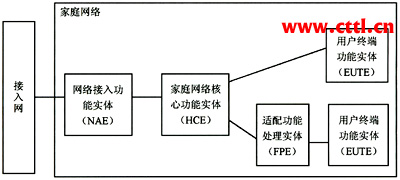 家庭網(wǎng)絡的參考模型如圖1所示。家庭網(wǎng)絡內(nèi)部的邏輯功能實體有4個,包括:
