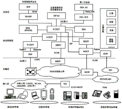 接入層支持各種有線和無線終端。固定和無線SIP終端可通過IP接入網(wǎng)直接鏈入,非SIP終端(如H.323)必須通過TAI(終端適配接口)完成H.323和SIP的轉(zhuǎn)換才能接入IP接入網(wǎng)。各種寬帶IP終端可通過MGW、MGCF、SGW實(shí)現(xiàn)與PSTN/PLMN域的傳統(tǒng)窄帶TDM(時(shí)分復(fù)用)終端實(shí)現(xiàn)互通。