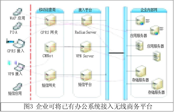 這里介紹的無線商務(wù)平臺適合沒有成型信息系統(tǒng)的企業(yè)接入,對于企業(yè)已經(jīng)建有辦公系統(tǒng)的情況,可以提供專線接入的無線商務(wù)解決方案(如圖3所示),企業(yè)通過專線接入無線商務(wù)平臺,這種情況需要對企業(yè)辦公系統(tǒng)進(jìn)行一定的改造來實(shí)現(xiàn)全部移動辦公功能。