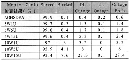 通過表3可以看出,隨著HSDPA功率分配的增加,網(wǎng)絡(luò)阻塞率和下行鏈路功率過載隨之增加,特別是功率增加到10W時(shí),增加幅度尤為明顯;在一定的HSDPA功率分配前提下,隨著網(wǎng)內(nèi)HSDPA用戶數(shù)的增加,網(wǎng)絡(luò)阻塞率和下行鏈路功率過載隨之增加,特別是用戶數(shù)增加到15人時(shí),增加幅度尤為明顯?梢奌SDPA網(wǎng)絡(luò)性能在一定程度上受限于HSDPA功率分配和網(wǎng)內(nèi)HSDPA用戶數(shù)。
