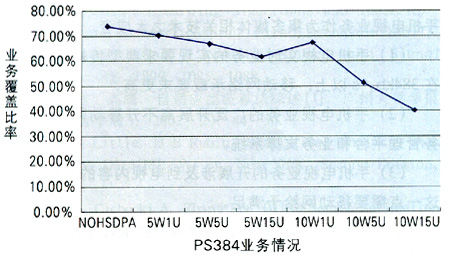 由圖1可知,當(dāng)HSDPA分配功率為5W時(shí),HSDPA對網(wǎng)絡(luò)覆蓋沒有很大影響;當(dāng)它為10W時(shí),如果HSDPA用戶數(shù)不大,影響也有限;但是,當(dāng)它為10W時(shí),如果HSDPA用戶數(shù)持續(xù)增加,則會產(chǎn)生嚴(yán)重影響。在下行從NOHSDPA的74%降低到10W15U的40.62%時(shí),PS384業(yè)務(wù)降低了近一半。同時(shí),隨著業(yè)務(wù)速率的提高,網(wǎng)絡(luò)影響越大。另外,在一定的HSDPA功率分配前提下,隨著HSDPA用戶數(shù)的增加,過載率增大,網(wǎng)絡(luò)中高速數(shù)據(jù)業(yè)務(wù)的比例隨之減少,各點(diǎn)上的用戶速率不斷降低;同時(shí),用戶的增多使得各小區(qū)的HSDPA發(fā)射功率不斷增大,導(dǎo)致區(qū)域中間各點(diǎn)的終端接收功率普遍增加。