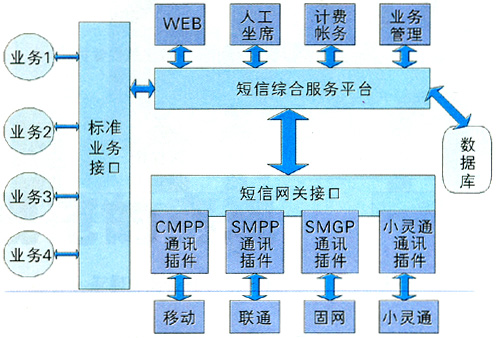 業(yè)務(wù)管理平臺是為運(yùn)營商提供的可快速啟動各種數(shù)據(jù)業(yè)務(wù)的平臺,具有強(qiáng)大的資源調(diào)度能力。它連接運(yùn)營商的基礎(chǔ)網(wǎng)絡(luò)和業(yè)務(wù)支撐系統(tǒng)(客服系統(tǒng)、計(jì)費(fèi)系統(tǒng)),為服務(wù)提供商/內(nèi)容提供商們提供各種移動資源(如短信息中心資源、用戶信息資源、語音資源等)、功能資源(如單點(diǎn)認(rèn)證、計(jì)費(fèi)、漫游控制等)及各種公共的資源引擎(如地理位置、語音交互、推送信息等)。業(yè)務(wù)支撐系統(tǒng)是運(yùn)營商為了開展業(yè)務(wù)必須建設(shè)的客服系統(tǒng)、營業(yè)系統(tǒng)、計(jì)費(fèi)系統(tǒng)等子系統(tǒng)。圖3是目前常用的綜合短信平臺[3]。