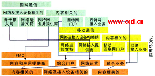 總之,在FMC新配置的價(jià)值鏈中,應(yīng)用和內(nèi)容的作用非常重要,因?yàn)樗麄冊(cè)谌诤蠒r(shí)將價(jià)值鏈中的各個(gè)部分連接起來(lái)。因此,可以認(rèn)為內(nèi)容和應(yīng)用的建立、積累將會(huì)推動(dòng)增值FMC業(yè)務(wù)的發(fā)展。今后隨著在內(nèi)容和業(yè)務(wù)領(lǐng)域?qū)⒊霈F(xiàn)更多不同的參與者,如內(nèi)容提供商、應(yīng)用提供商和中間件提供商,F(xiàn)MC價(jià)值鏈將進(jìn)一步得到更深層次的合作、擴(kuò)張和合并。這些在新的價(jià)值鏈中出現(xiàn)的更多獨(dú)立但又不同的實(shí)體,將直接反映FMC融合的特征。