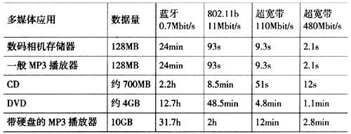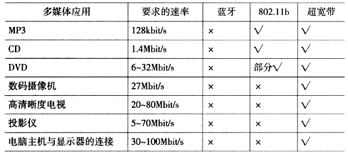 2.0接口相當(dāng),遠(yuǎn)遠(yuǎn)高于無線局域網(wǎng)802.11b的11 Mbit/s,也比下一代無線局域網(wǎng)802.11a/g的54 Mbit/s高出近一個(gè)數(shù)量級(jí)。UWB通信的功耗較低,能更好地滿足使用電池的移動(dòng)設(shè)備的要求。另外,UWB信號(hào)的功率譜密度非常低,信號(hào)難以被檢測到,再加上采用的跳頻、直接序列擴(kuò)頻等擴(kuò)頻多址技術(shù),使非授權(quán)者很難截獲傳輸?shù)男畔,因而安全性非常好。?是一些典型的實(shí)時(shí)多媒體應(yīng)用對(duì)不同無線傳輸技術(shù)的數(shù)據(jù)傳輸速率的要求。從表中可以看出,如果采用無線的方式來進(jìn)行傳輸,只有UWB技術(shù)可以滿足各種應(yīng)用的要求。