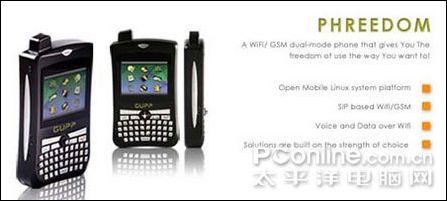 GUPP公司PHREEDOM手機(jī)基于VoWifi/GSM雙模的手機(jī)可以讓用戶(hù)自由選擇網(wǎng)絡(luò)。除了正常的GSM網(wǎng)絡(luò)之外,在有WiFi覆蓋的地方,用戶(hù)便可以使用WiFi網(wǎng)絡(luò)進(jìn)行通話(huà),從而節(jié)約話(huà)費(fèi)。在WiFi環(huán)境中,它還也可以進(jìn)行網(wǎng)頁(yè)瀏覽、郵件收發(fā)、數(shù)據(jù)下載等操作。