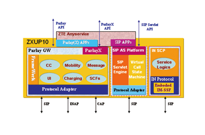 ZXUP10作為開放業(yè)務(wù)平臺(tái),包括Parlay網(wǎng)關(guān)和SIP應(yīng)用平臺(tái),對(duì)外提供標(biāo)準(zhǔn)的Parlay/ParlayXAPI和SIPServletAPI,屏蔽底層網(wǎng)絡(luò)的差異性,第三方通過調(diào)用標(biāo)準(zhǔn)接口,快速生成Web等方式的第三方應(yīng)用,帶來業(yè)務(wù)開發(fā)、提供模式的重大改變。