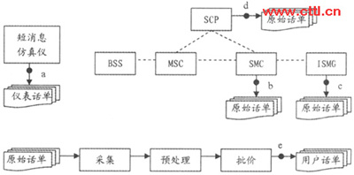 通過對移動點(diǎn)對點(diǎn)短消息計(jì)費(fèi)原理的分析,可以把整個計(jì)費(fèi)過程劃分為兩大環(huán)節(jié):計(jì)費(fèi)點(diǎn)原始話單的生成和后期計(jì)費(fèi)處理系統(tǒng)的處理。如果其中任何一個環(huán)節(jié)出現(xiàn)差錯都會降低用戶計(jì)費(fèi)話單的準(zhǔn)確性。因此在測試過程中采取了用戶層面和設(shè)備層面相結(jié)合的方法:一方面使用仿真儀表大量模擬點(diǎn)對點(diǎn)短消息的發(fā)送和接收,得到用戶話單;一方面分析各個計(jì)費(fèi)點(diǎn)生成的原始話單。
