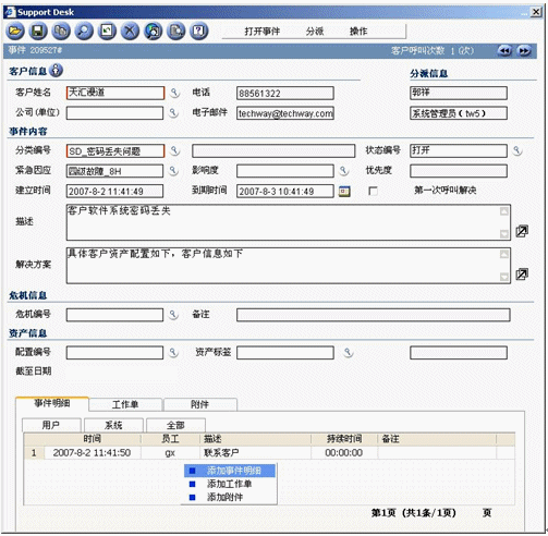 事件記錄應(yīng)該在某個服務(wù)臺工具中記錄和跟蹤,該工具最好是作為集成的服務(wù)管理工具集的構(gòu)成部分。該工具應(yīng)該在引發(fā)新的事件時提供最基本的事件記錄。比如為了幫助提高效率,當(dāng)你在天匯幫助臺的用于記錄事件的事件窗口中輸入請求發(fā)起者的姓名時,利用客戶數(shù)據(jù)庫可以自動填充諸如位置、部門和聯(lián)系詳細信息等字段。天匯幫助臺還支持使用計算機電話集成
