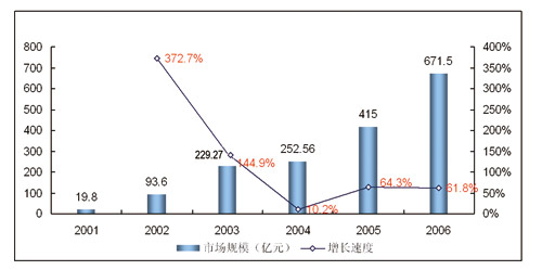 圖 2001-2006年中國移動(dòng)用戶增值業(yè)務(wù)市場規(guī)模