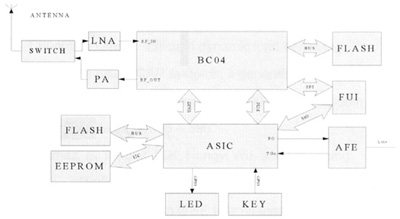 其中,BC04支持最大4個活動連接(包括耳機),同時支持兩路SCO語音,所以語音通過PCM和ASIC PCM相接可以有多路被送到模擬端,從而實現(xiàn)3方通話。ASIC部分實現(xiàn)PCM語音數(shù)據(jù)與模擬語音信號的相互轉換,通過發(fā)送和接收PSTN信令,負責對人機界面的控制。它通過GPIO(General