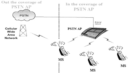 如圖3所示,使用藍牙CTP MS(mobile station)和PSTN AP,通過本地交換機與固網(wǎng)相連。其中,MS為雙模終端,可以根據(jù)不同網(wǎng)絡的資費差異預先設置采用何種網(wǎng)絡接打電話。在藍牙覆蓋范圍內,根據(jù)設置,CTP