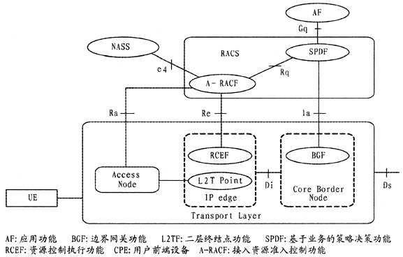 RACS是NGN的組成部分之一,將業(yè)務(wù)層的資源需求與網(wǎng)絡(luò)承載層的資源分配相關(guān)聯(lián),主要完成策略控制、資源預(yù)留、接納控制、網(wǎng)絡(luò)地址轉(zhuǎn)換(NAT)和防火墻穿越等功能。RACS通過一系列策略為應(yīng)用提供基于傳輸?shù)目刂品⻊?wù),只要該應(yīng)用支持RACS接口,RACS就能保證任意應(yīng)用能夠請求到與其服務(wù)相匹配的傳輸資源。同時,RACS為運(yùn)營商提供多種不同接納控制的方法,并設(shè)置各自的承載服務(wù)策略。RACS為各種服務(wù)提供獲得網(wǎng)絡(luò)資源的方法,使得用戶終端可以獲得所提供服務(wù),其總體功能結(jié)構(gòu)如圖3所示[5]。