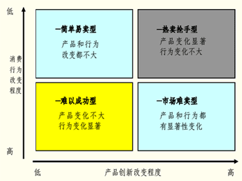 一般來說,產(chǎn)品創(chuàng)新程度越大,取得突破性的成就就越大,但這往往需要消費(fèi)者改變消費(fèi)行為和習(xí)慣。消費(fèi)行為的改變是一個(gè)漸進(jìn)的過程。對(duì)于企業(yè)來說,開發(fā)一個(gè)對(duì)客戶有價(jià)值的創(chuàng)新產(chǎn)品,要想獲得成功,必須盡量減少消費(fèi)者行為的改變。我們以消費(fèi)行為改變程度和產(chǎn)品創(chuàng)新改變程度兩方面進(jìn)行組合得到一個(gè)矩陣:
