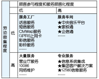表1中以“★”標(biāo)識(shí)的服務(wù)基本上都是電信運(yùn)營(yíng)企業(yè)開展移動(dòng)信息化后向客戶提供的服務(wù),可以明顯看出,更高的顧客參與度、更多的顧客化是這些服務(wù)的共同特點(diǎn),所以,移動(dòng)信息化運(yùn)營(yíng)的就是由服務(wù)工廠向服務(wù)車間轉(zhuǎn)型、由大量服務(wù)向?qū)I(yè)服務(wù)轉(zhuǎn)型。