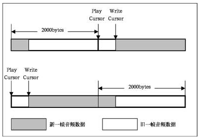 從理論上講,這已經(jīng)保證了音頻回放的流暢性。但在實(shí)現(xiàn)過程中,由于操作的對(duì)象是一幀的音頻數(shù)據(jù),其回放的時(shí)間僅是0.25秒,所以必須考慮的一個(gè)問題是程序的反應(yīng)速度問題。如果忽略由事件觸發(fā)到真正用Lock函數(shù)鎖定緩沖區(qū)的部分以進(jìn)行新數(shù)據(jù)寫入之間的時(shí)間,則這種實(shí)現(xiàn)方法沒有任何問題。除了最開始的兩幀數(shù)據(jù)外,新的一幀數(shù)據(jù)會(huì)緊跟在前一幀數(shù)據(jù)之后,彼此之間沒有重疊部分,也沒有空隙存在,能很好地達(dá)到音頻回放的流暢效果。但事實(shí)上,由事件觸發(fā)到真正用Lock函數(shù)鎖定緩沖區(qū)的部分以進(jìn)行新數(shù)據(jù)的寫入之間還必須經(jīng)過線程監(jiān)聽到事件,分析事件對(duì)應(yīng)的緩沖區(qū),然后再觸發(fā)相應(yīng)的回調(diào)函數(shù)來進(jìn)行