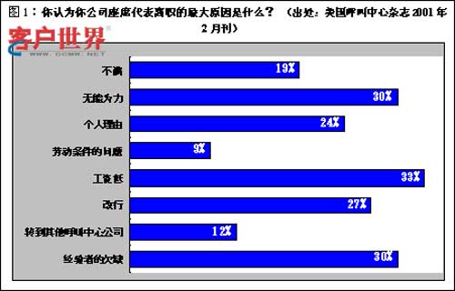 圖1是美國(guó)呼叫中心的調(diào)查結(jié)果。從顯示的結(jié)果來看,辭職的最大原因是工資低,其次是升職機(jī)會(huì)少。其中為了從事其他職業(yè)而辭職的占27%,要轉(zhuǎn)到別的客服中心工作的占12%?吹竭@個(gè)結(jié)果之后,發(fā)現(xiàn)即使在美國(guó),客服中心有關(guān)人員也沒有得到相應(yīng)的待遇。