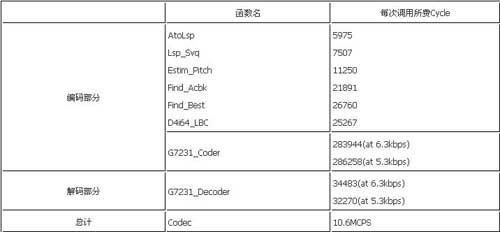 經過C語言級和匯編級的多種優(yōu)化,最后實現了一路G.723.1的編解碼需要花費10.6MCPS,整個代碼的程序空間為208K byte(程序中包括了部分c6201的庫函數),數據空間為8K byte,碼本大小20k byte,多通道的上下文數據為1.48K byte。200MHz的C6201每秒可以實時編解碼16路語音信號。所有代碼全部通過了ITU-T測試矢量的測試。表1是各主要模塊的運算量。