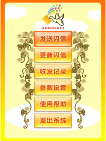 “閃信”的主操作界面設(shè)計(jì)簡(jiǎn)潔、顏色以明快的橙色位置。功能選項(xiàng)整齊的排列在屏幕中央。功能項(xiàng)共分為6大項(xiàng)“發(fā)送閃信、收發(fā)記錄、更新閃信、參數(shù)設(shè)置、使用幫助、退出系統(tǒng)”功能項(xiàng)的設(shè)置簡(jiǎn)潔,功能名稱使人看過之后就可以迅速理解了各個(gè)選項(xiàng)的功能重點(diǎn)。