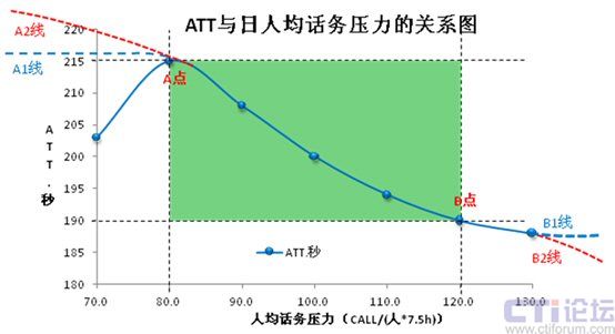 所以,在其它影響因素穩(wěn)定的情況下,當(dāng)人均話(huà)務(wù)壓力小于80或大于120的時(shí)候,ATT應(yīng)該保持在這兩個(gè)壓力點(diǎn)對(duì)應(yīng)的時(shí)長(zhǎng)附近(即190~215秒,如A1和B1線走勢(shì))我們暫且認(rèn)為這是合理的波動(dòng)范圍;若出現(xiàn)A2線走勢(shì),浪費(fèi)的必然是人員效率;若出現(xiàn)B2線走勢(shì),犧牲的必然是服務(wù)質(zhì)量。