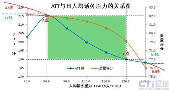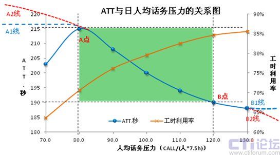 - 人均話(huà)務(wù)壓力在80以下,ATT并沒(méi)有依線性進(jìn)一步增大,而是從215秒“扭頭”下降,說(shuō)明ATT受到了某種有效制約;