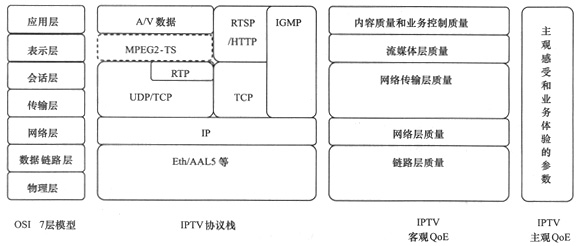 圖2 IPTV業(yè)務質(zhì)量模型與OSI 7層模型和IPTV協(xié)議棧的關(guān)系