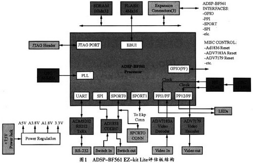 Blackfin561視頻編碼器的硬件結(jié)構(gòu)如圖1所示。該硬件平臺采用ADI公司的ADSP-BF561 EZ-kit